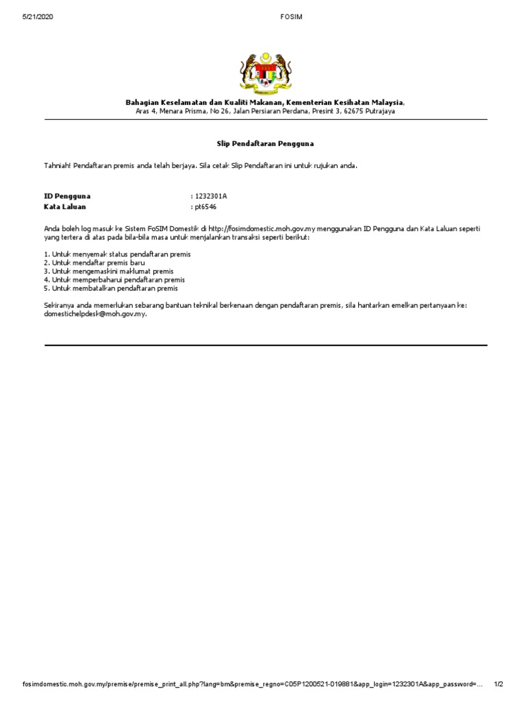 Cara pendaftaran premis makanan anda dengan sistem FOSIM Kementerian Kesihatan Malaysia. Print frame kan pastu tampal laa kat dinding kedai. Isikan Borang Pendaftaran Premis Makanan ID Pengguna Kata Laluan dan maklumat peribadisyarikat dengan tepat.